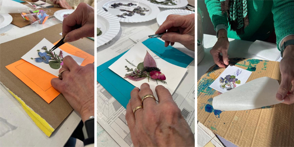 At their March 18 meeting, Kingston Hill Gardeners made note cards with botanical prints by arranging petals and leaves on absorbent paper and then hammering