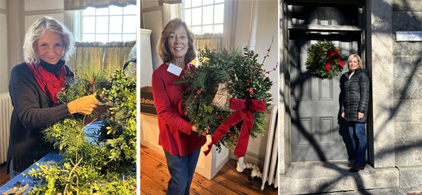 December 2, 2024 - Every year members of the Kingston Hill Gardeners gather greens, ribbon and wire, and get to work assembling holiday wreaths to decorate the public buildings in the village. Mary Arakelian (left) demonstrates how to assemble a wreath, Robin Shields shows the finished product, and Maria Zannella hangs a KHG wreath on a door of the Kingston Free Library.